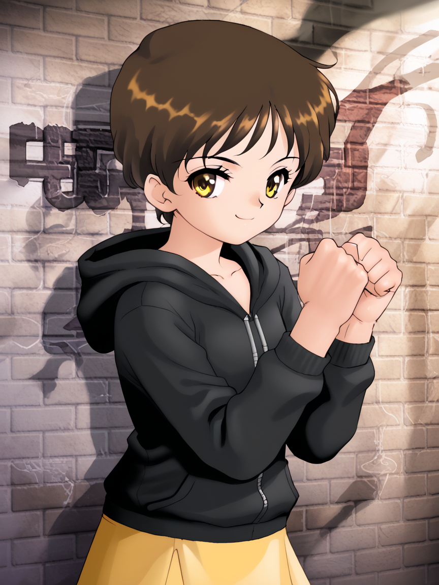 yamano wakako, short hair, black hoodie, yellow skirt, miniskirt