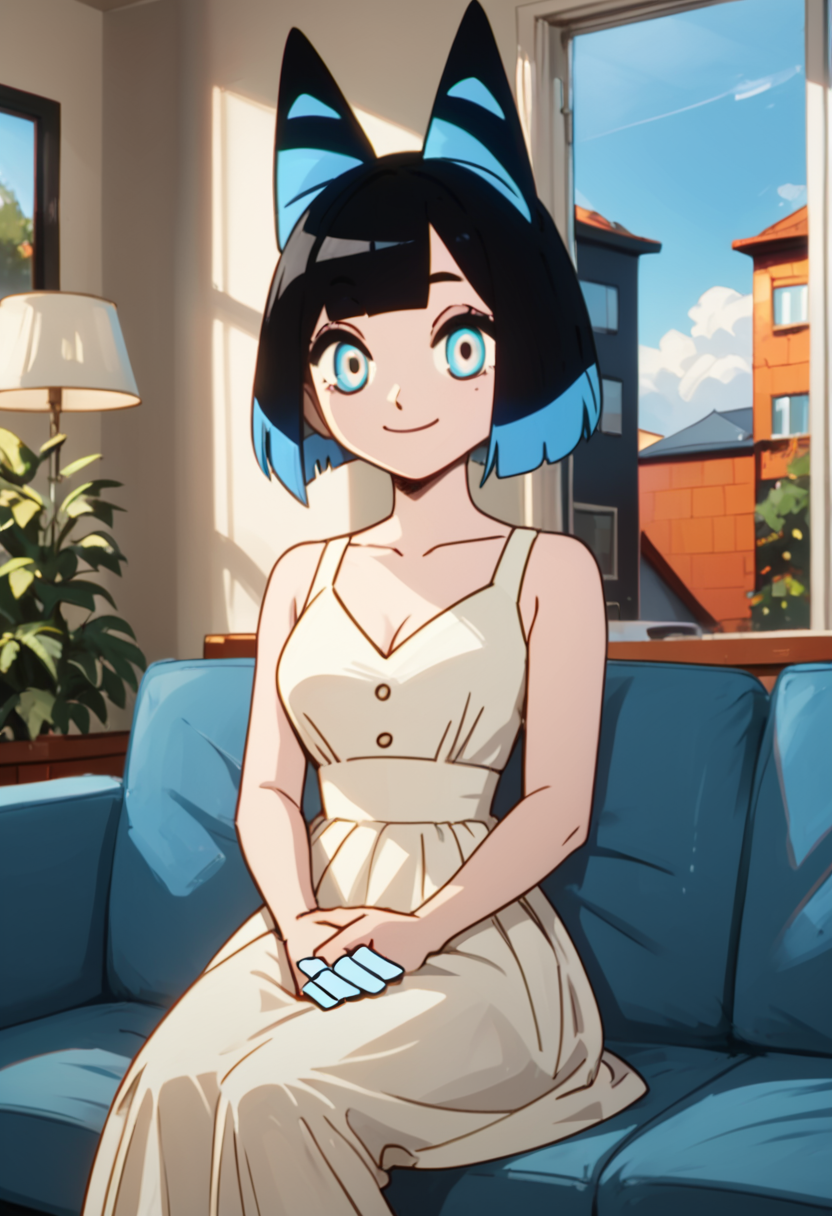 1girl, kozuk1, black hair, short hair, multicolored hair, animal ears, dress, blue eyes,