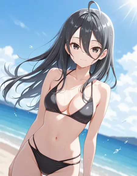 <lora:ayano_kimishima_anime_v5-soralz:1>, ayano kimishima, long hair, black hair, ahoge, hair between eyes, long bangs, black eyes