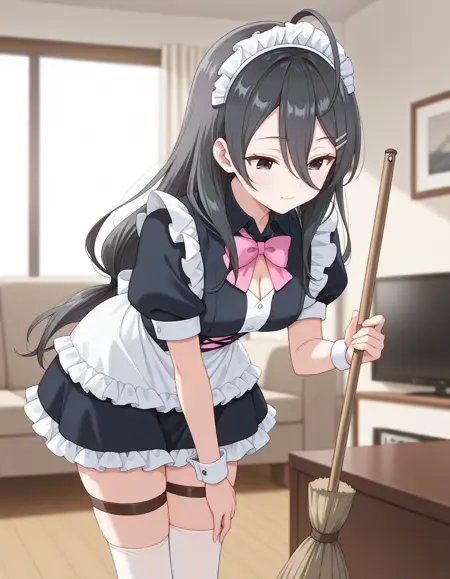 maid outfit, maid headdress, hairclip, low-tied long hair, cleavage cutout, black dress, frilled dress, pink bowtie, puffy sleeves, short sleeves, frills, white apron, waist apron, thigh straps, white thighhighs, sandals