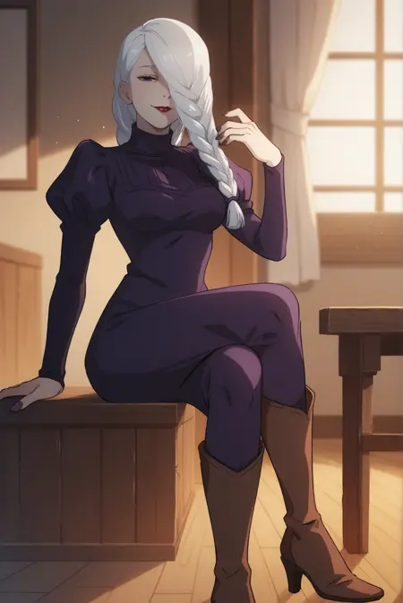 long hair, braided ponytail, hair tie, front ponytail, hair over one eye, purple eyes, red lipstick, half-closed eyes,