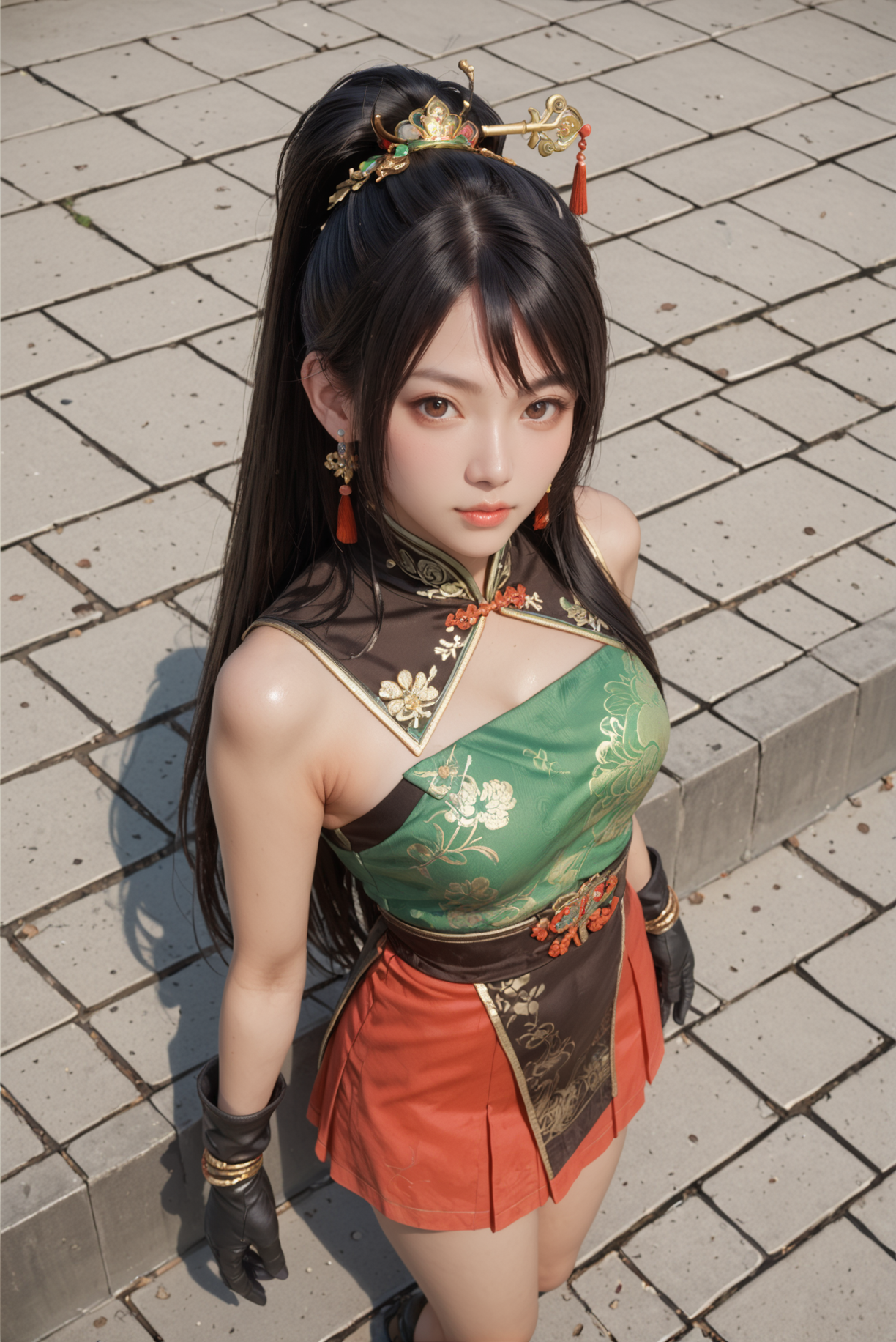 Positive prompt recommended: guanyiping, 1girl, solo, long hair, black hair, ponytail, jewelry, earrings, brown eyes, gloves, skirt