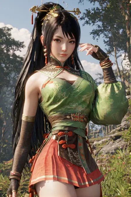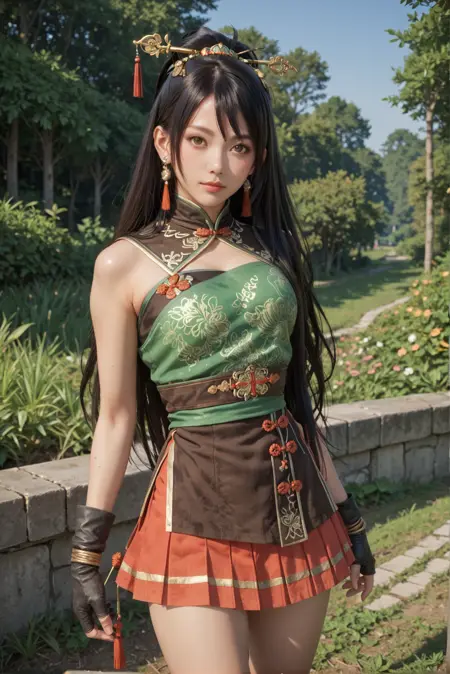 Positive prompt recommended: guanyiping, 1girl, solo, long hair, black hair, ponytail, jewelry, earrings, brown eyes, gloves, skirt