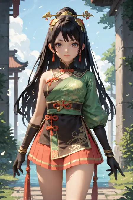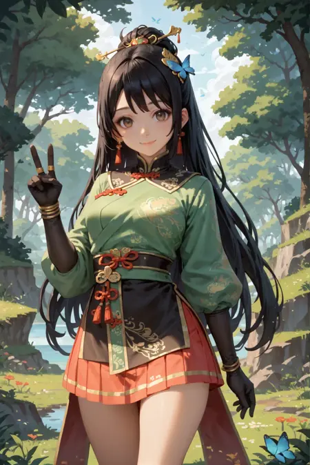 Positive prompt recommended: black hair, long hair, brown eyes, gloves, jewelry, earring, skirt, hair ornament, chinese clothes
