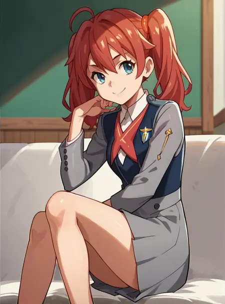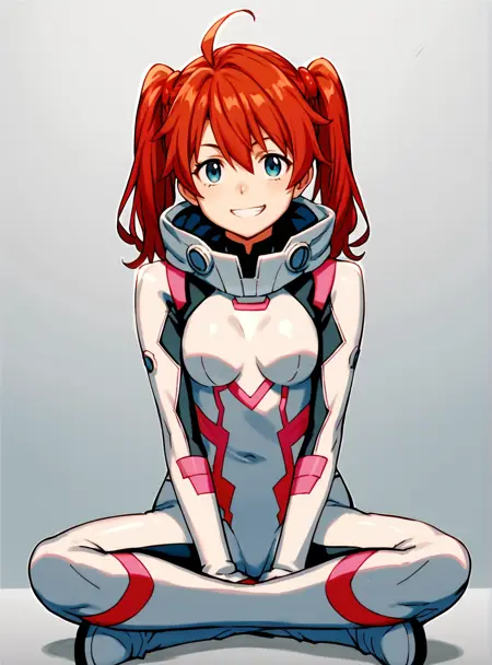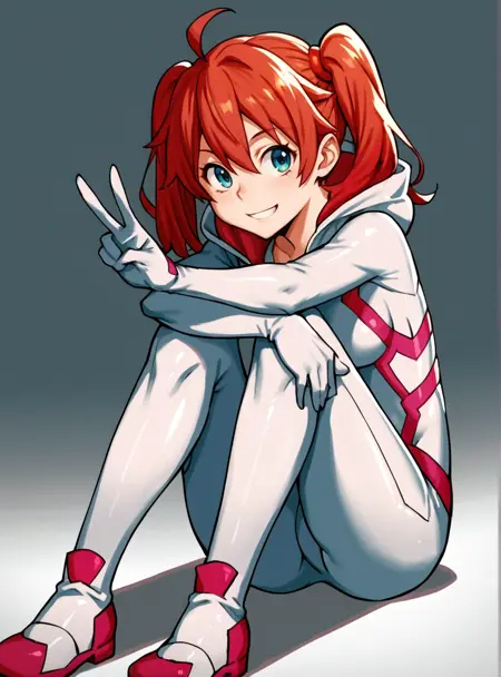 提示:1girl, ,双马尾, 单人,, ahoge, , 蓝眼睛, 微笑, 红发制服:mikuuniform 校服紧身衣:mikusuit,紧身衣帽子放下