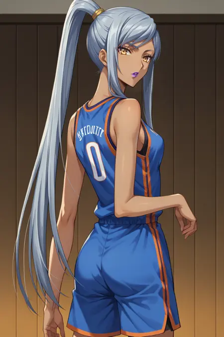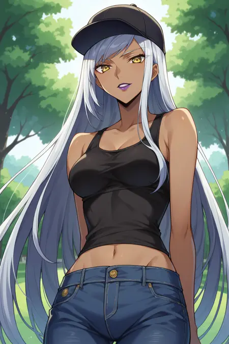 Triggers: KJOVilletta, white hair, yellow eyes, long hair, high ponytail, dark skin, purple lipstick,