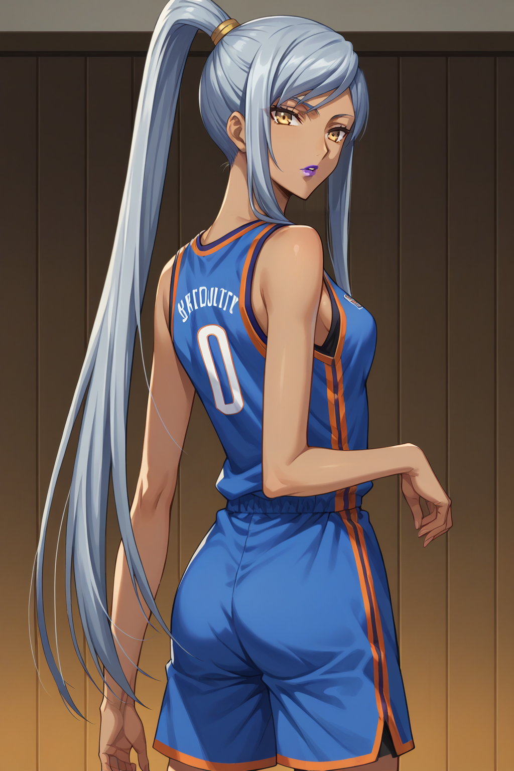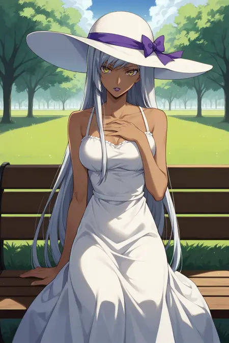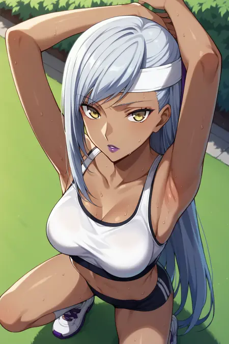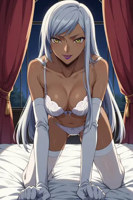 KJOVilletta, white hair, yellow eyes, long hair, high ponytail, dark skin, purple lipstick,