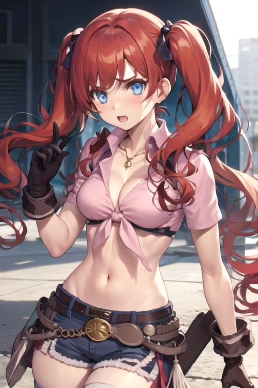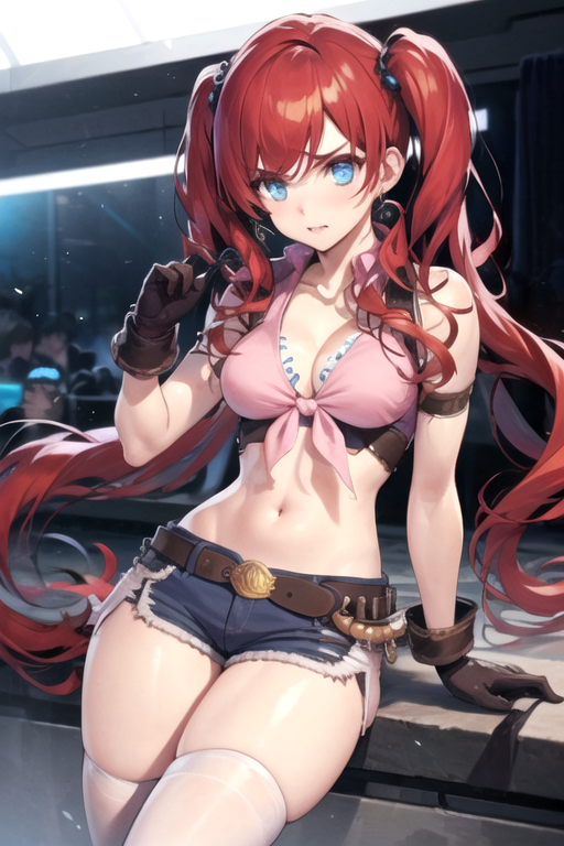 RedHairedC0wGirl, 1girl, solo, long hair, blue eyes, pink shirt, white thighhighs, gloves, navel, cleavage, twintails, jewelry, medium breasts, red hair, short shorts, midriff, belt, crop top, front-tie top, blue shorts, cutoffs, fringe trim