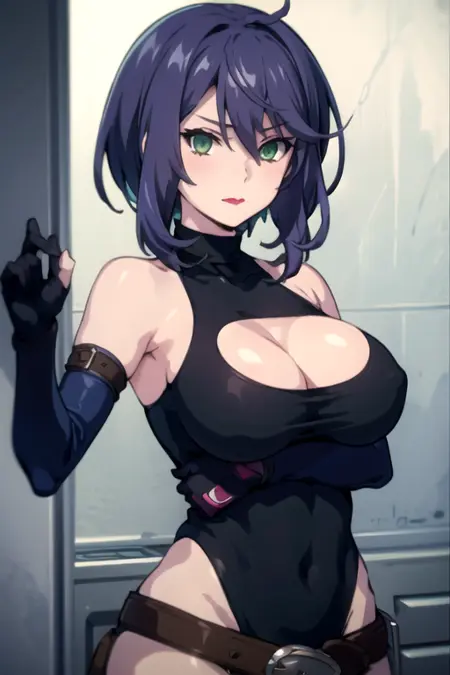 TrineHalden, 1girl, solo, short hair, large breasts, elbow gloves, cleavage, hair between eyes, bare shoulders, green eyes, blue hair, purple hair, belt, black leotard, turtleneck, cleavage cutout, lipstick