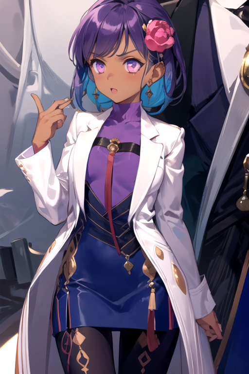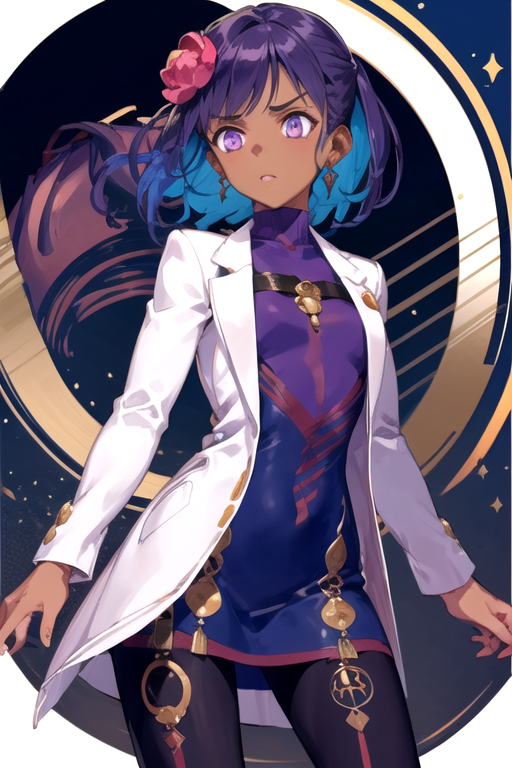 AyusFate, 1girl, solo, short hair, dark blue skirt, black hair, hair ornament, jewelry, blue hair, purple eyes, purple hair, pantyhose, earrings, hair flower, dark skin, dark-skinned female, labcoat, turtleneck,