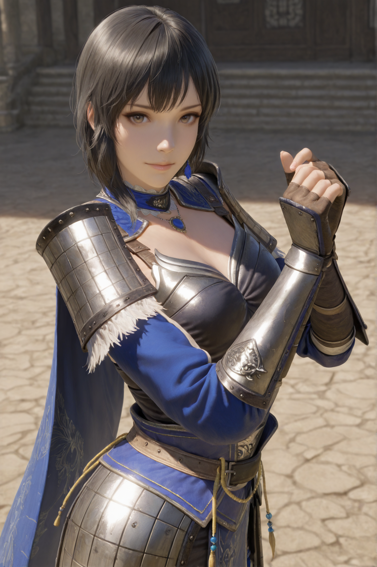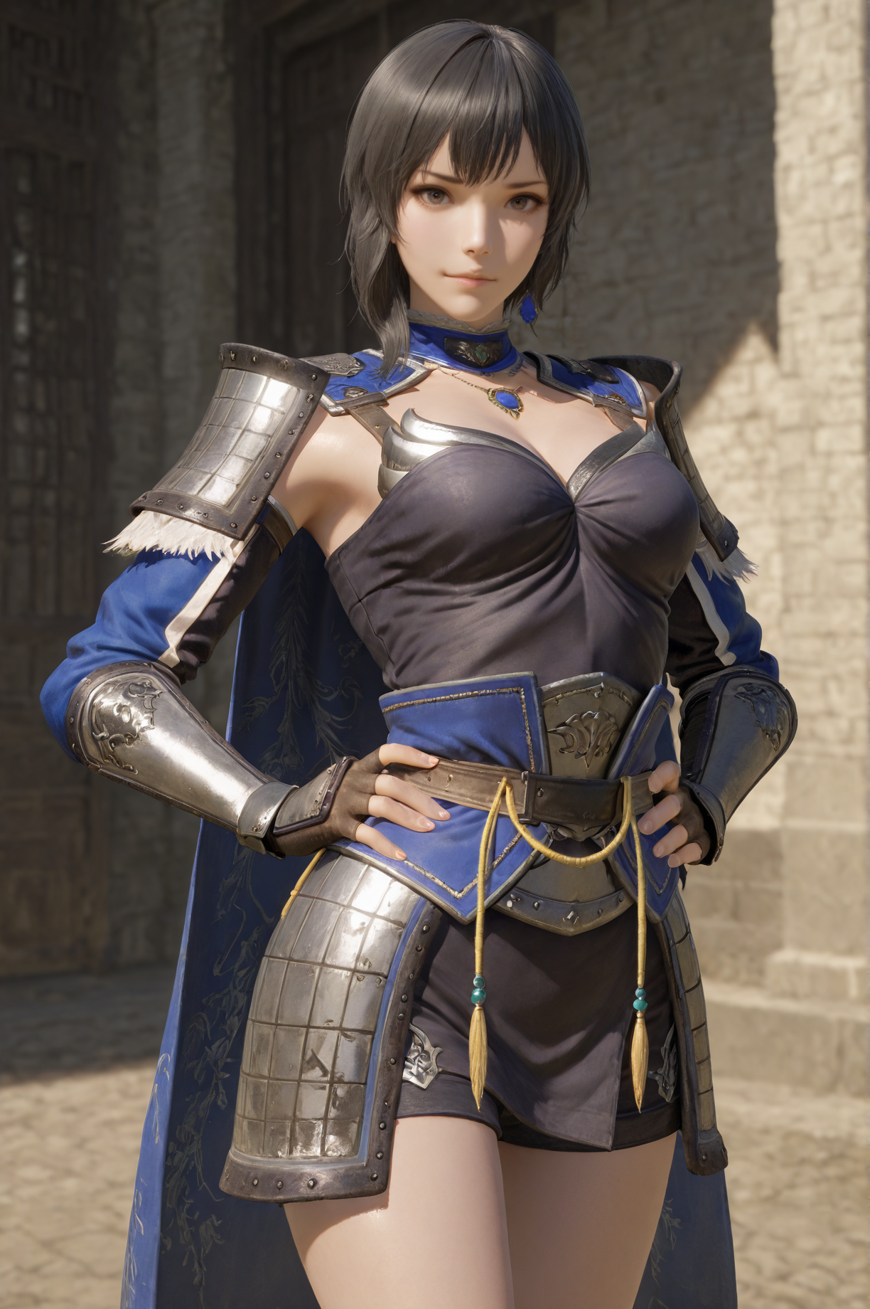 추천 긍정 프롬프트: wangyi, 1girl, solo, 검은 머리, 단발, 갑옷, 손가락 없는 장갑, 망토, 보석
