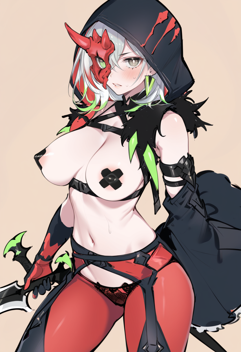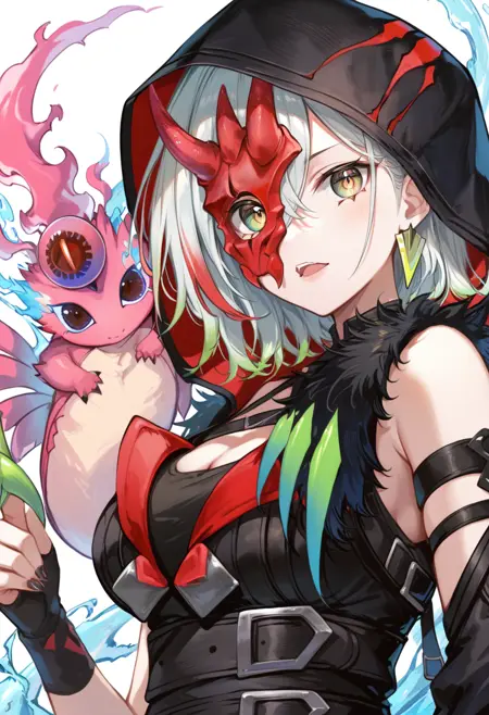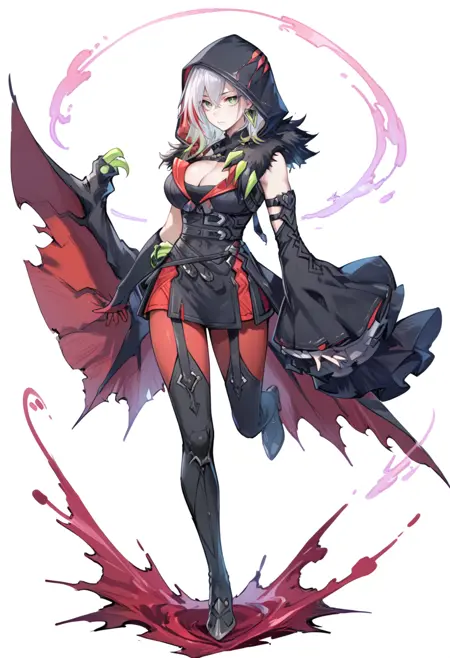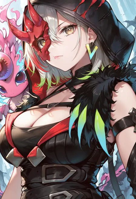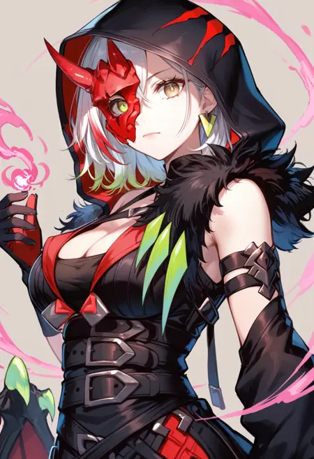 标签(服装):单只黑色长袖,黑色兜帽,红色面具,黑色长裙,单只黑色翅膀,红色连裤袜,单只黑色手套,兜帽上拉,绿色耳环