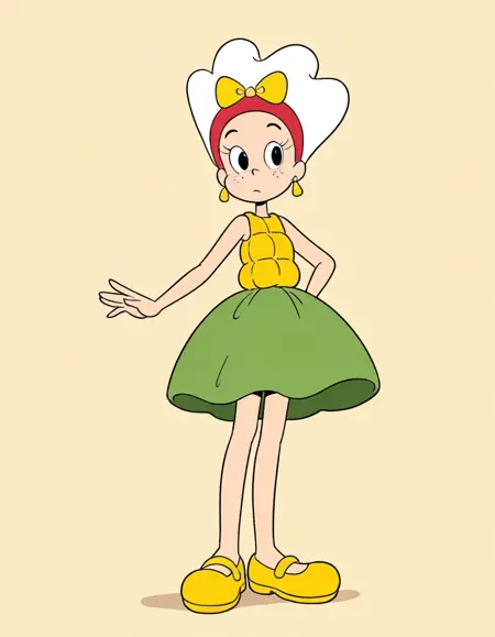 | 训练词汇 | Pipoca_V2, 1girl, skirt, bow, jewelry, hair bow, earrings, shoes, sleeveless, black eyes, green skirt, yellow bow, yellow shirt, designed with features resembling popcorn, white hair is styled like popcorn, freckles, yellow Mary janes, red headband已复制! |