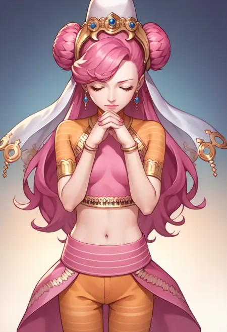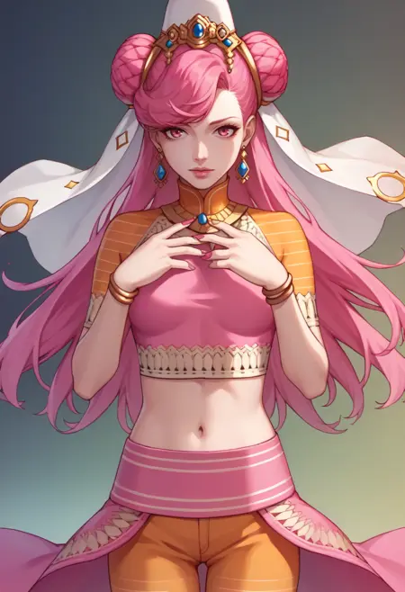 パールバーティ、ピンクの目、ピンクの髪、長い髪、二つ結び、額の宝石、帽子、ヴェール、ピンクの唇、ジュエリー、イヤリング、ブレスレット、ピンクのシャツ、オレンジの袖、クロップドトップ、お腹、へそ、ピンクの爪、オレンジのズボン、ピンクのスカート