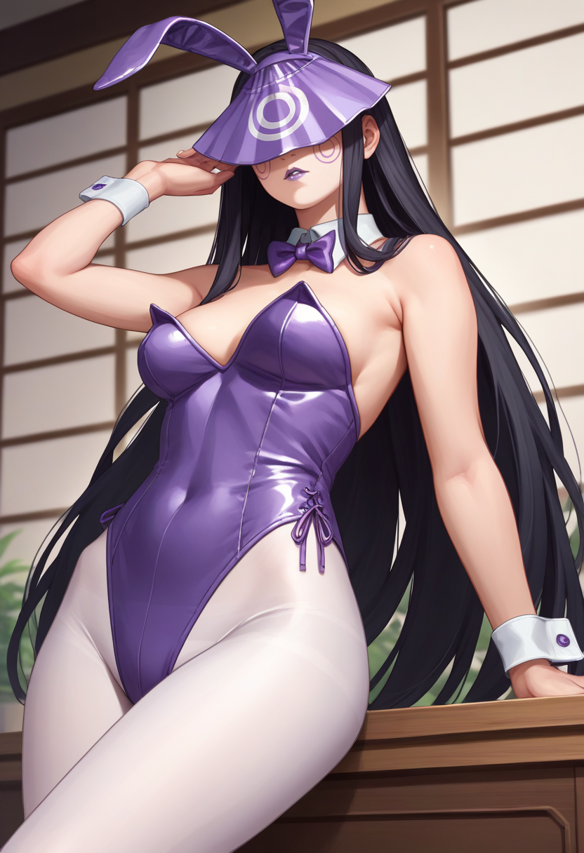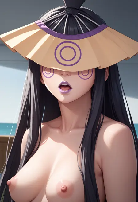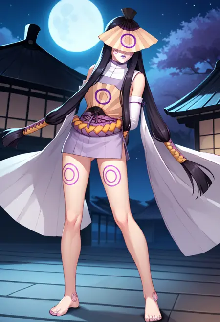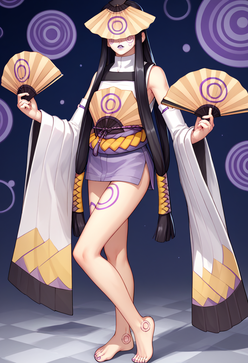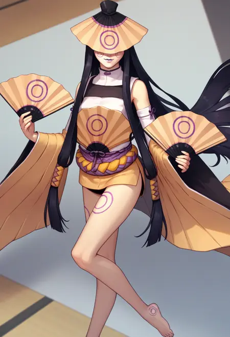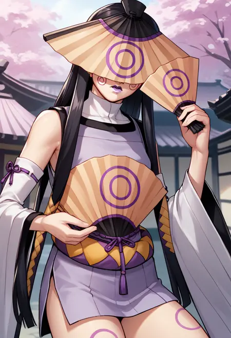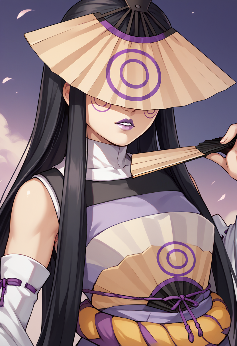 amenouzume、目を覆った、黒髪、非常に長い髪、顔の模様、紫色の唇、ノースリーブ、取り外し可能な袖、扇子、手扇、タトゥー、和服、足を露出