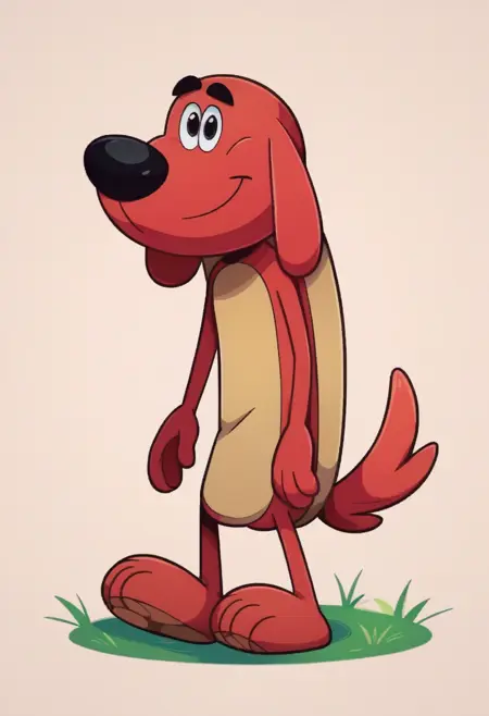 Laricao_V2, tail, black eyes, no humans, resembling a red hotdog with a long beige bun on back until tthe top of head, anthropomorphized, prominent black nose, floppy ears. Dog, furry, red fur