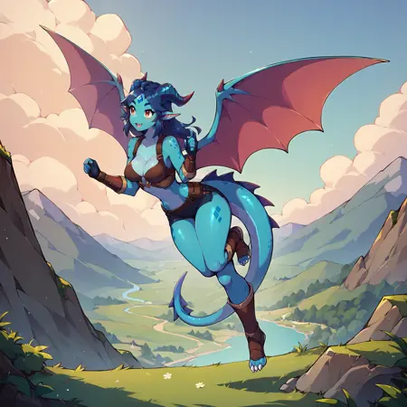 It will produce this specific blue dragon woman character if you use the prompt `dragon woman`. It also responds to the prompts `face focus, dragon ears, horns, nose scales, smile, blue skin, black bodysuit, dark blue hair, thick eyebrows, red-orange eyes, looking at viewer, blue forehead crystal, parted lips, fangs, sharp teeth, from front, simple background`