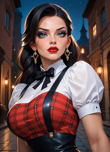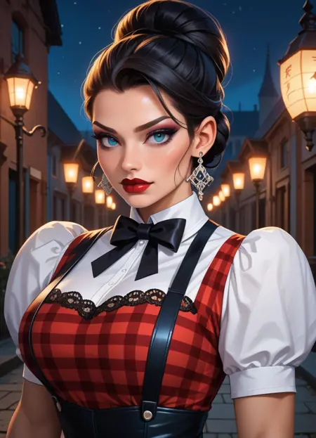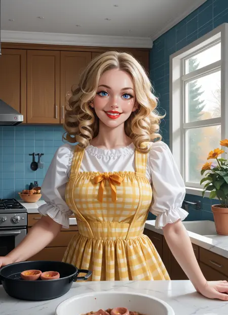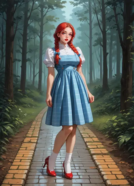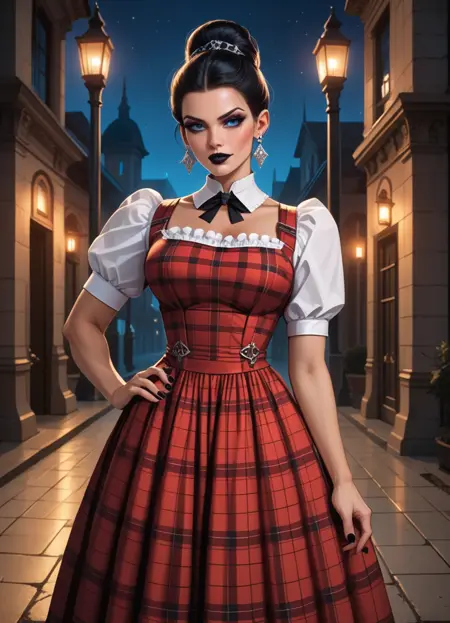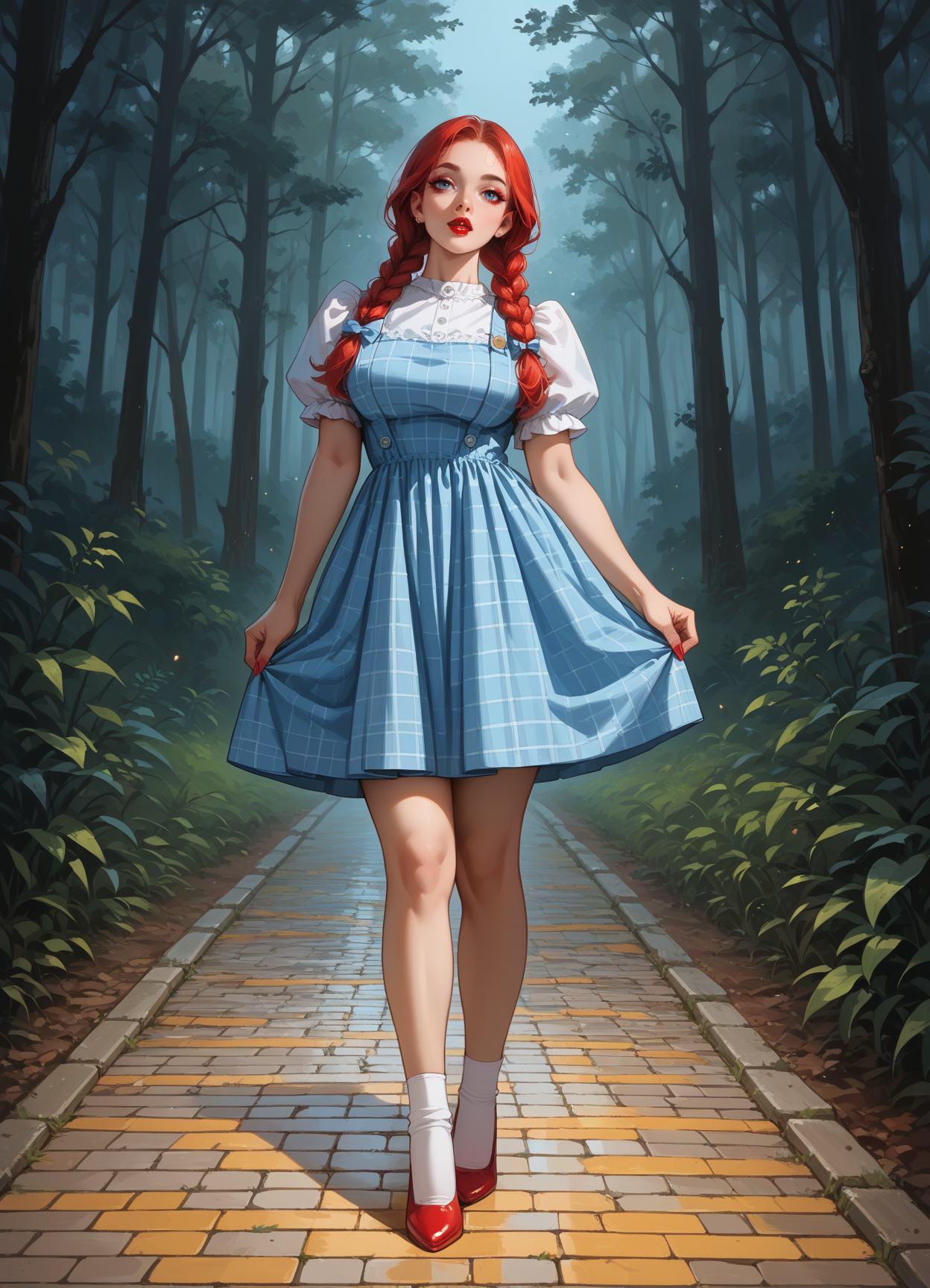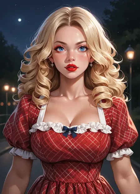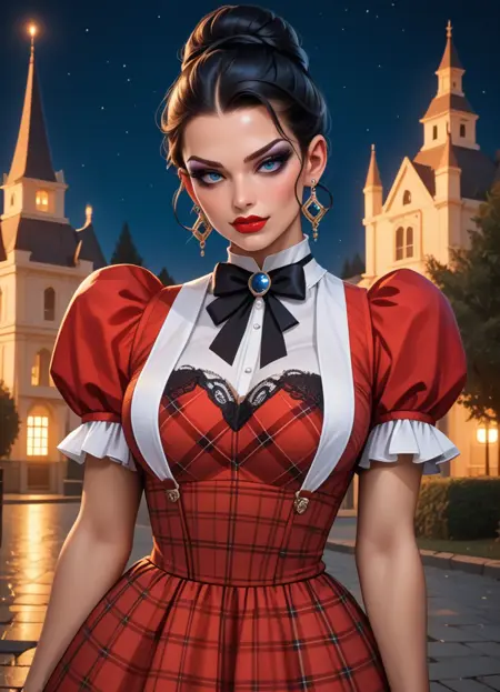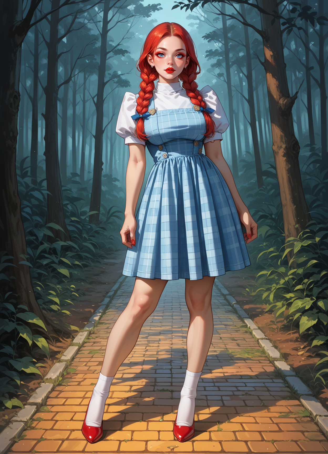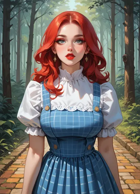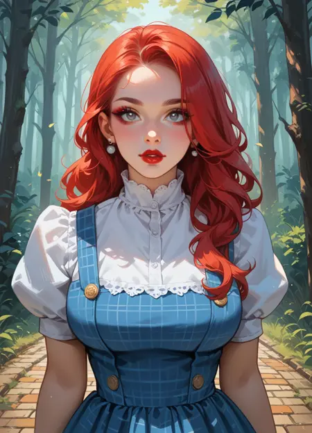 D.G.: 소녀, 싱글, 긴 빨간 쌍뜨개 머리, 메이크업, 립스틱, hud_drthy_drss, 파란 드레스, 피나포어 드레스, 짧은 풍선 소매, 체크무늬