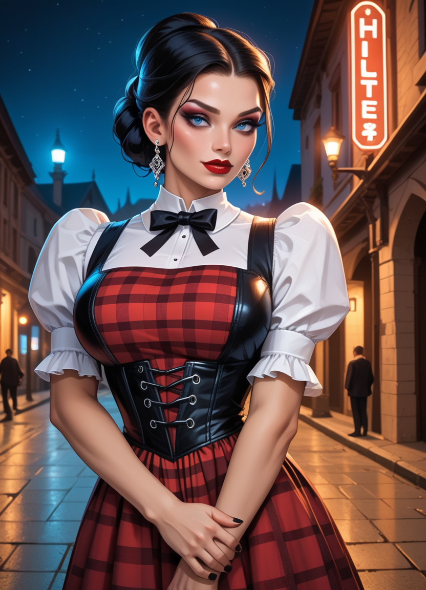 키워드: hud_drthy_drss, 파란 드레스, 피나포어 드레스, 짧은 풍선 소매, 체크무늬,