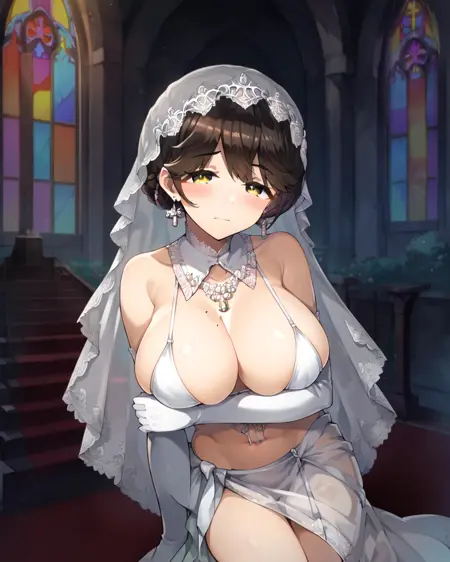 단일 단발머리, 땋은 단발머리, 신부 베일, 분리된 칼라, 목걸이, 흰색 비키니, 마이크로 비키니, 흰색 팔꿈치 장갑, 레이스 테두리, 사롱, 귀걸이