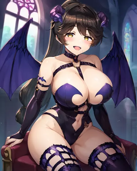 악마 소녀, 가슴 하네스, 하트 O-링, 보라색 수크루부 복장, 수크루부 다리 착용, 팔꿈치 장갑