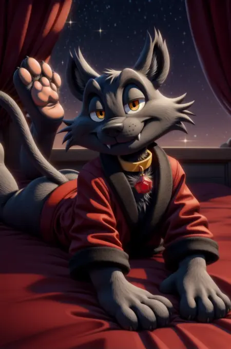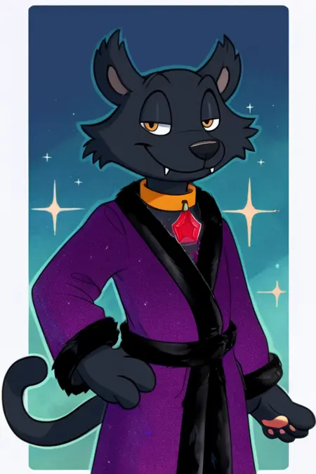 辅助词:“黑色毛发、金色眼睛、宝石项圈、红色吊坠、长袍、尖牙”