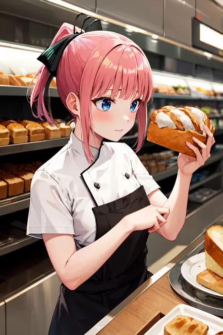 nn1, nakano nino, 1girl, hair ribbon, short hair, ponytail, chef uniform, chef, white shirt, black skirt