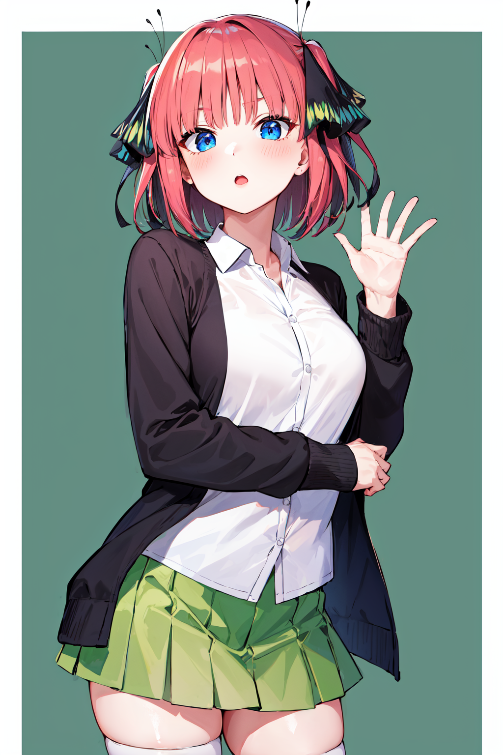 nn1, 1girl, hair ribbon, short hair, green skirt, white shirt, black cardigan, open clothes, white thighhighs, long sleeves