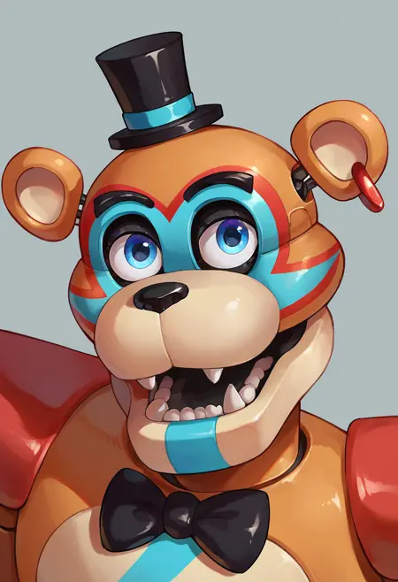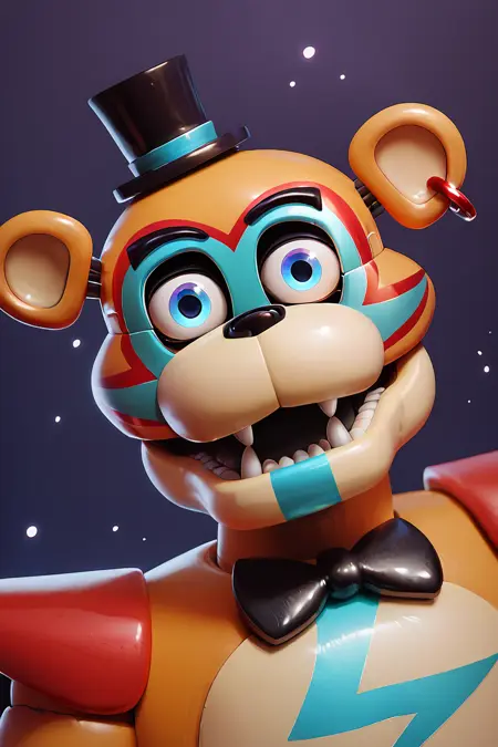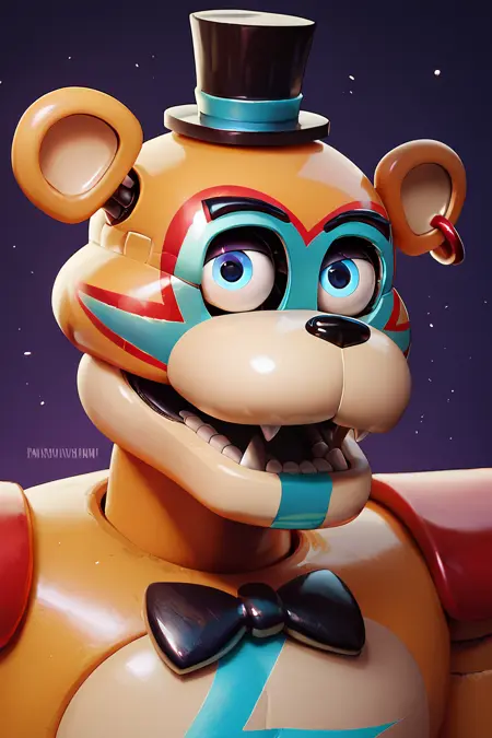 glamrockfreddy, animatronic/furry, blue/yellow/white/purple eyes, earrings, top hat, orange fur(optionaly)