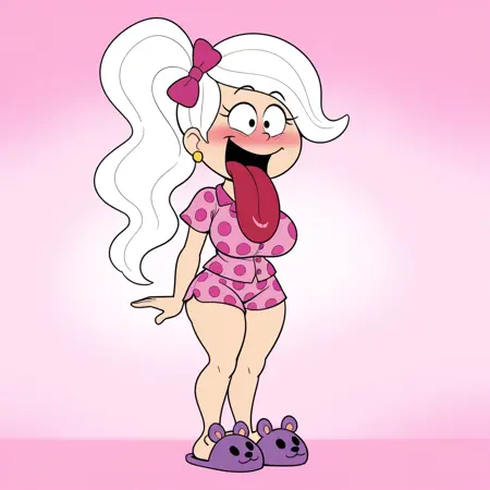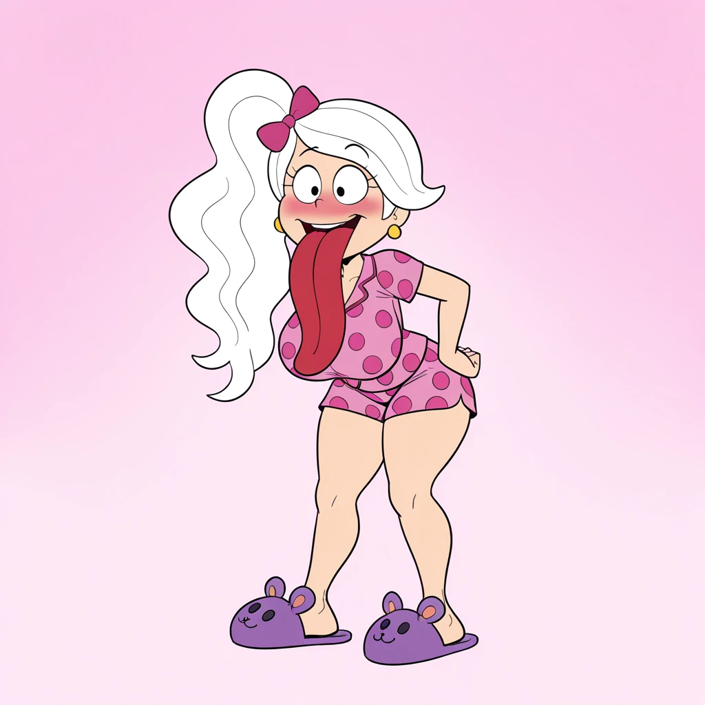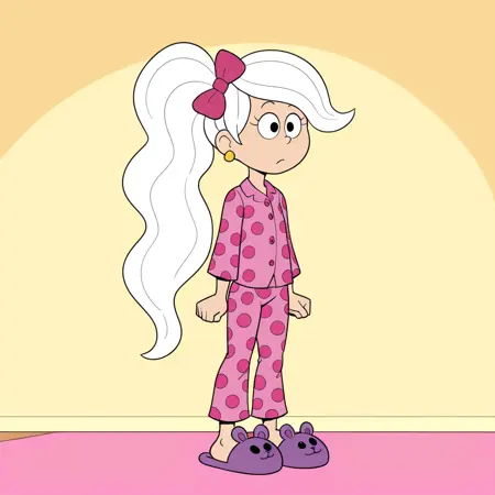 MariaMoleV2, 1girl, long hair, bow, jewelry, white hair, hair bow, earrings, side ponytail, polka dot, pajamas, slippers, animal slippers, long white hair, pink bow, big round black eyes, pink pajamas with large polka dots, purple bear slippers.