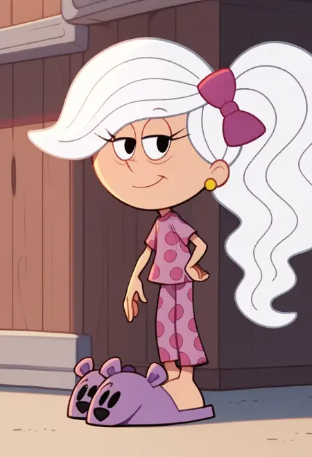 Maria_Mole_V2, 1girl, long hair, bow, jewelry, white hair, hair bow, earrings, side ponytail, polka dot, pajamas, slippers, animal slippers, long white hair tied with a pink bow, big round black eyes, pink pajamas with large polka dots, purple slippers shaped like bear heads.