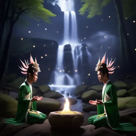 "6": "全身,多条尾巴,动物,睫毛,景深,光粒子,石灯笼,机甲,彩色皮肤,瀑布,男性焦点,星空,校服,城堡,精灵,花朵,1970年代 \\(风格\\),清酒,竹林,萤火虫",