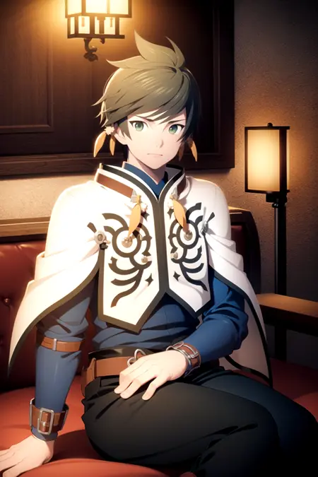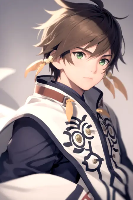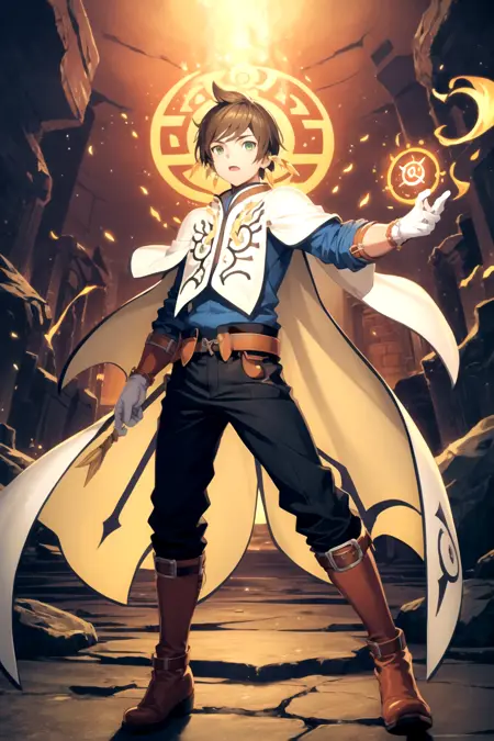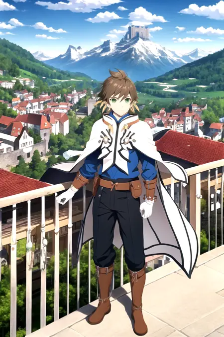 その他のプロンプト:ソロ、茶色の髪、緑の目、ブーツ、マント、フルボディ、白い手袋、ジュエリー、フェザーのイヤリング、男性中心
