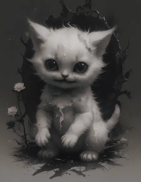 프롬프트에 "무서운", "어두운", "우울한", "기묘한", "부패한", "공포스러운" 등의 공포 관련 단어를 사용하여 효과를 강화할 수 있습니다. 잉크 효과를 더 강조하고 싶다면 "잉크 얼룩"과 "잉크 떨어짐" 같은 단어를 사용할 수 있습니다. 또한 "귀여운"이라는 단어를 추가하면 무서운-귀여운 주제에도 잘 어울립니다.