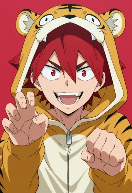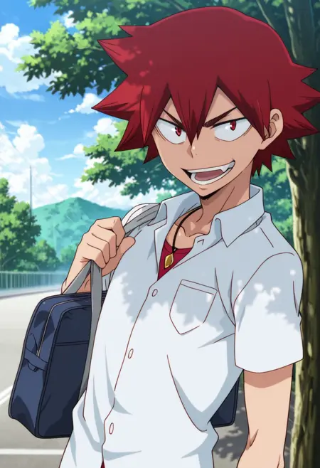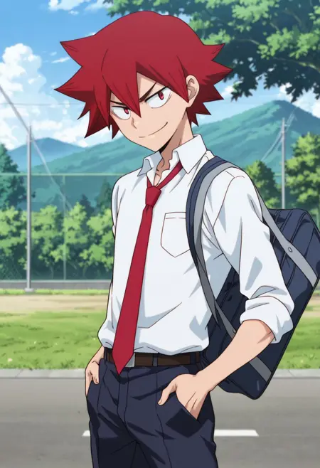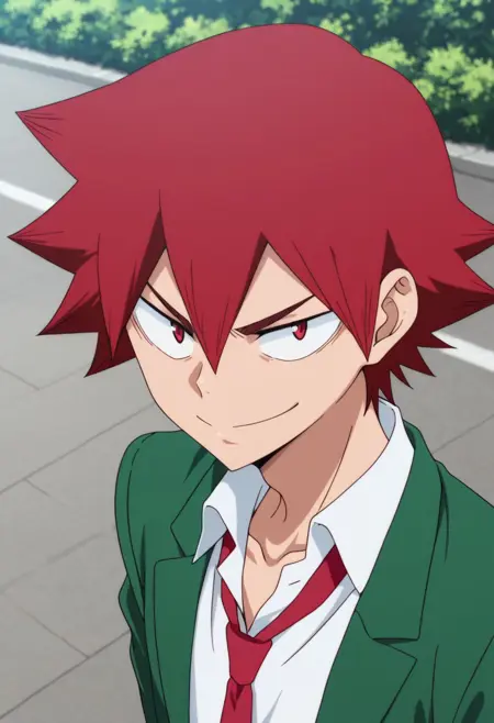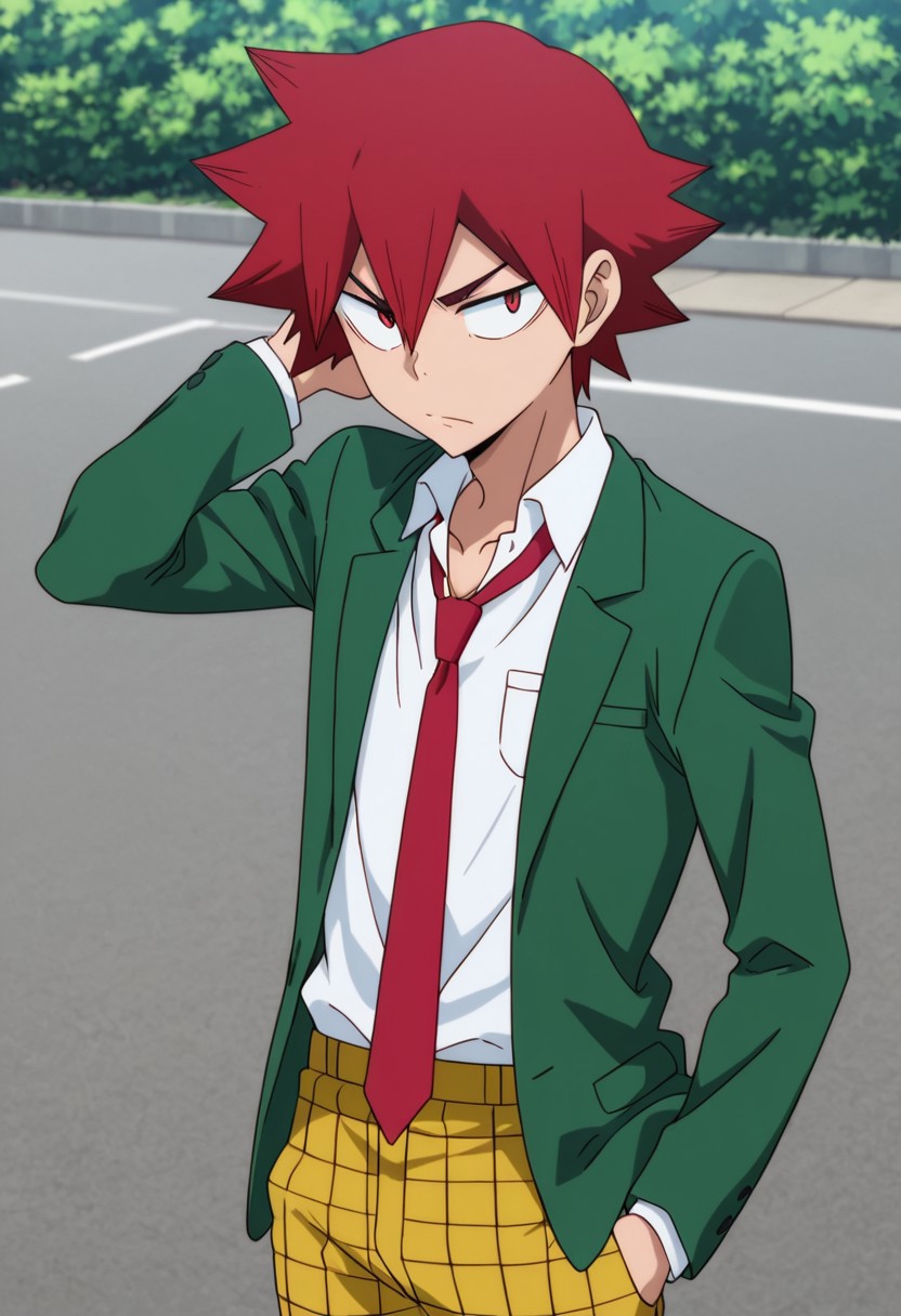 学校 - ナルコ、1人の少年、男性中心、ネクタイ、制服、赤髪、ジャケット、緑のジャケット、シャツ、赤い目、白いシャツ、とげとげした髪、赤いネクタイ、長袖、衿付きシャツ、開いた服、開いたジャケット、チェック柄のズボン、チェック柄、ズボン