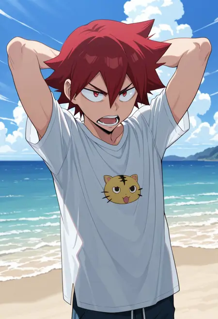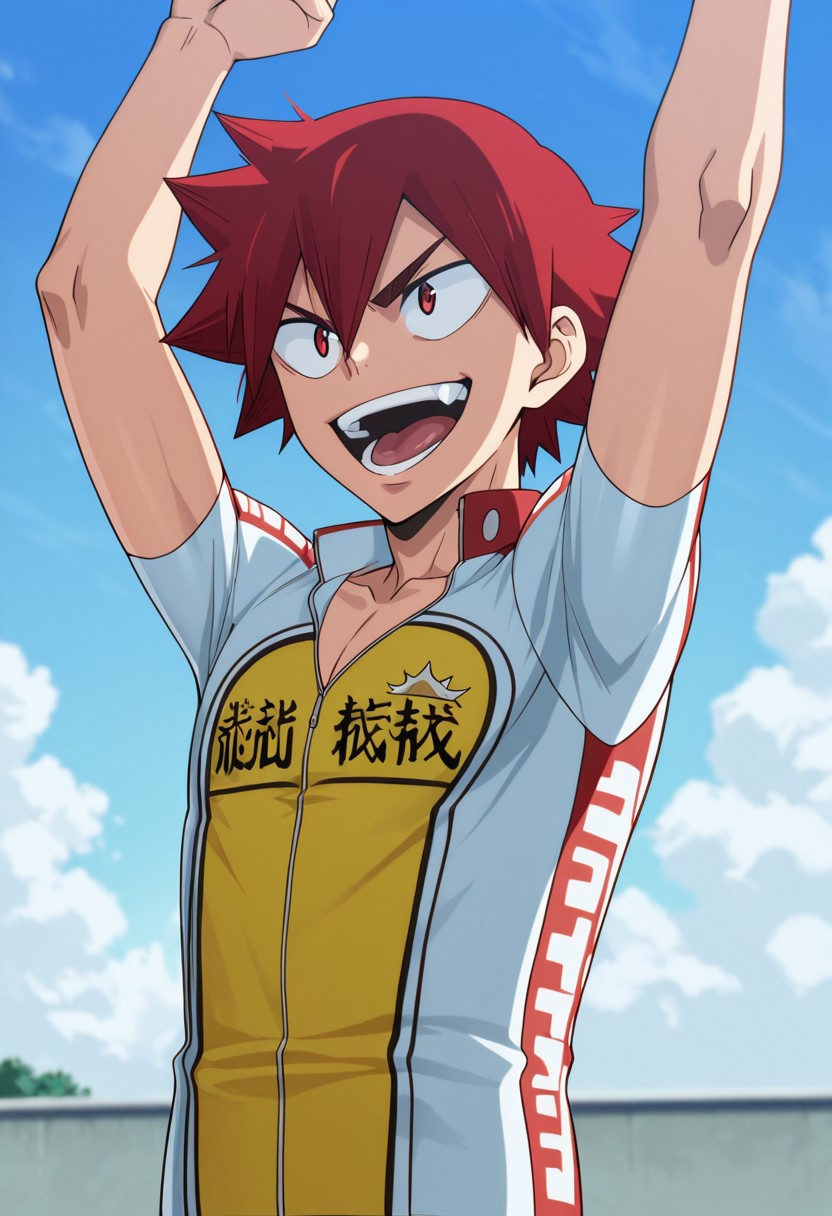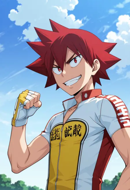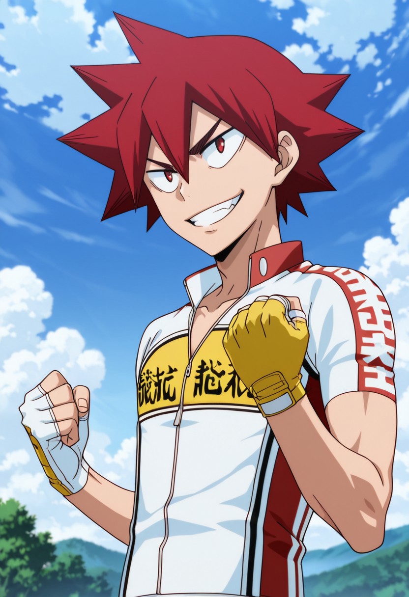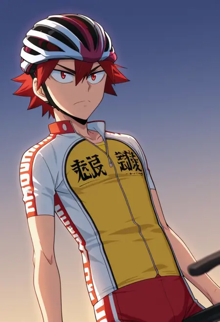 自転車 - 1人の少年、男性中心、単独、赤い目、赤髪、サイクリングユニフォーム、白と黄色のシャツ、部分的にジッパーが開いている、短袖、白い手袋、指なし手袋、黄色のショーツ、サイクリングショーツ、白い靴下、靴、黄色の履物、