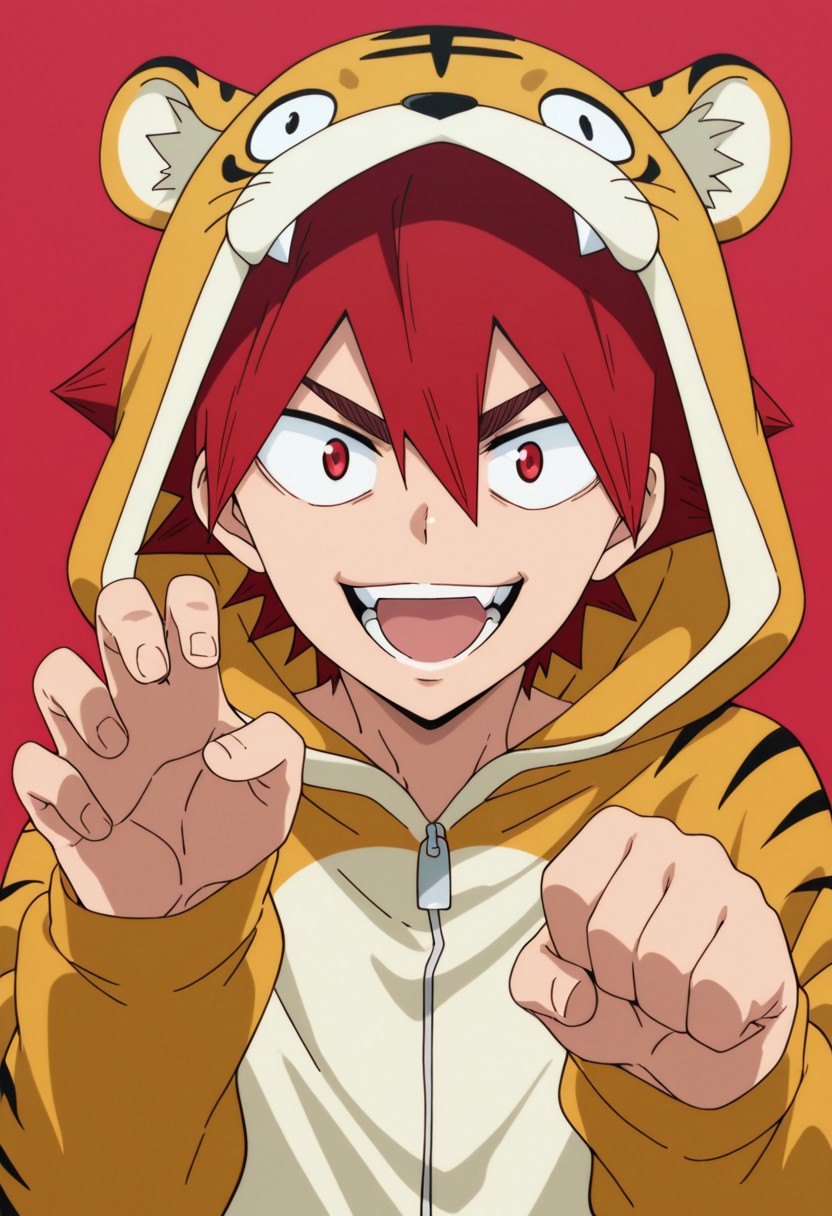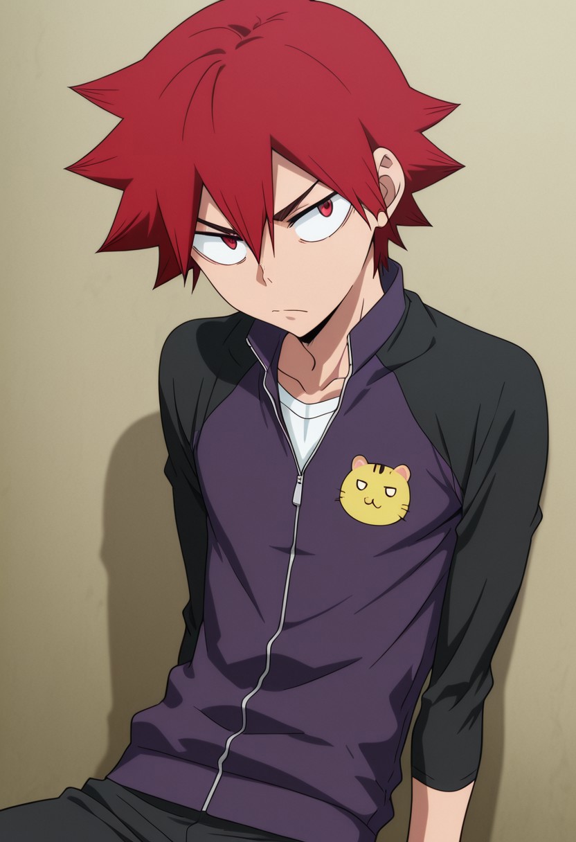 学校 - 1人の少年、男性中心、単独、赤い目、赤髪、制服、白いシャツ、衿付きシャツ、赤いネクタイ、緑のジャケット、開いたジャケット、黄色のズボン、チェック柄のズボン、