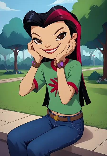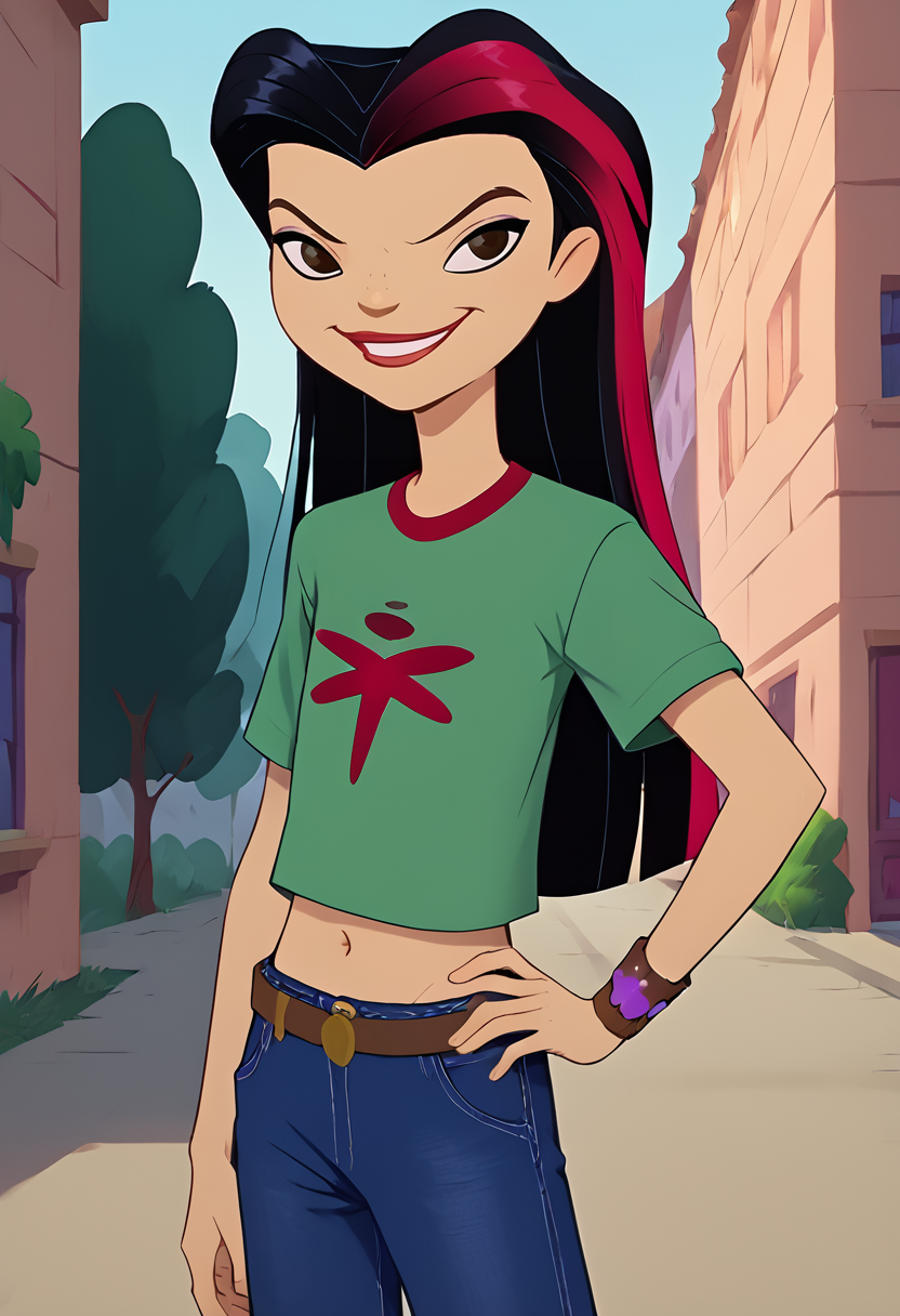 트리거 태그: juniper lee 주요 태그: 검은 머리, 녹색 셔츠, 파란 바지, 벨트,