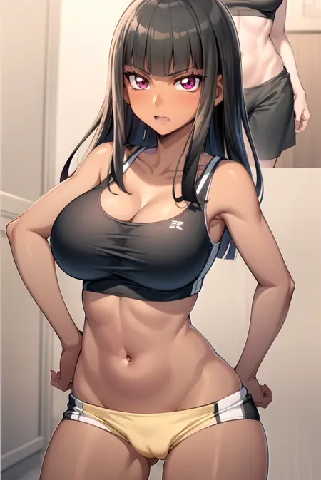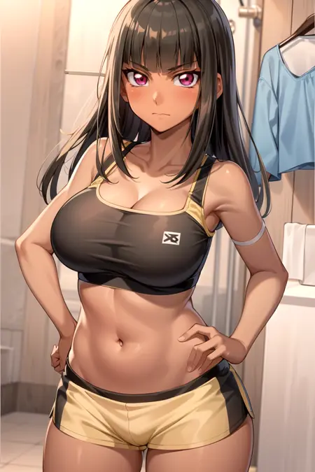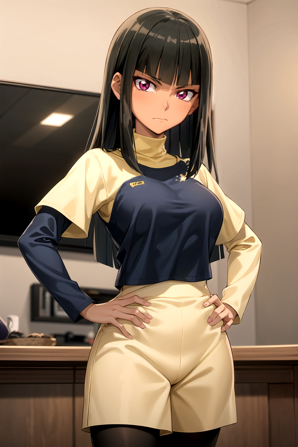 アクティベーションタグ: masumi kotsu。黒髪、ストレートな前髪、赤い目(または紫の目)、長い髪、黒い肌、黒肌の女性と組み合わせて使用