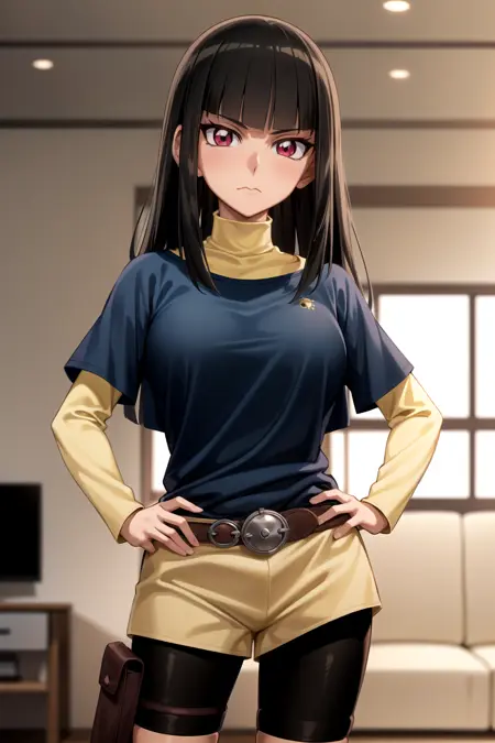 彼女の衣装のタグ: 青シャツ、半袖シャツ、黄シャツ、長袖シャツ、レイヤードスリーブ、タートルネック、自転車用ショートパンツ、黒ショートパンツ、黄ショートパンツ、ベルト、青ブーツ、アンクルブーツ、デュエルディスク