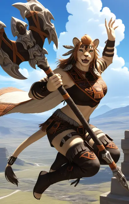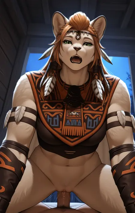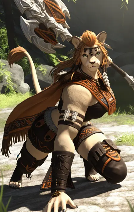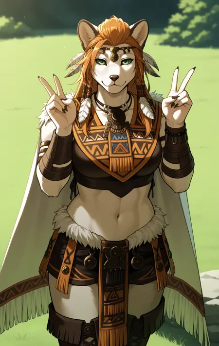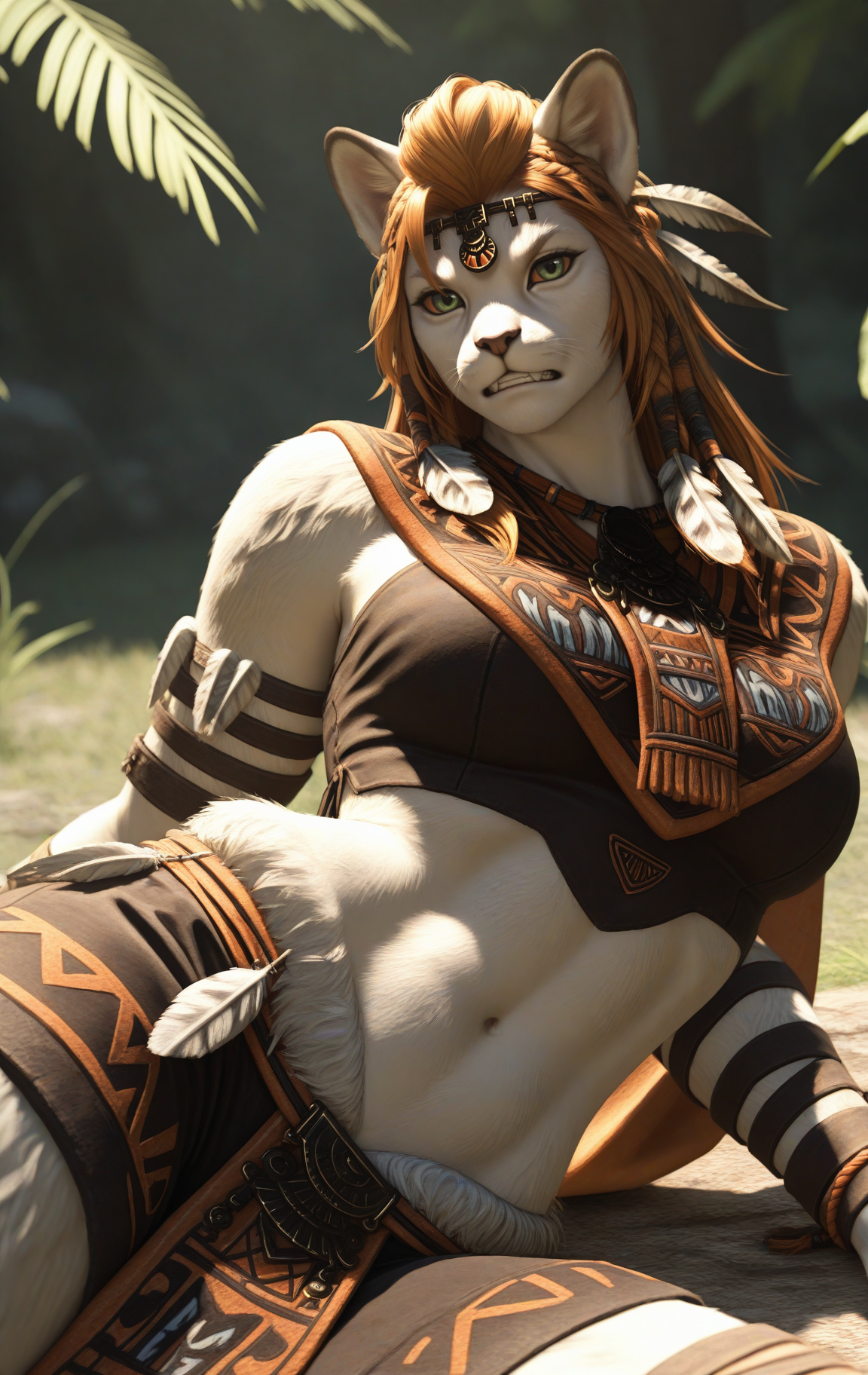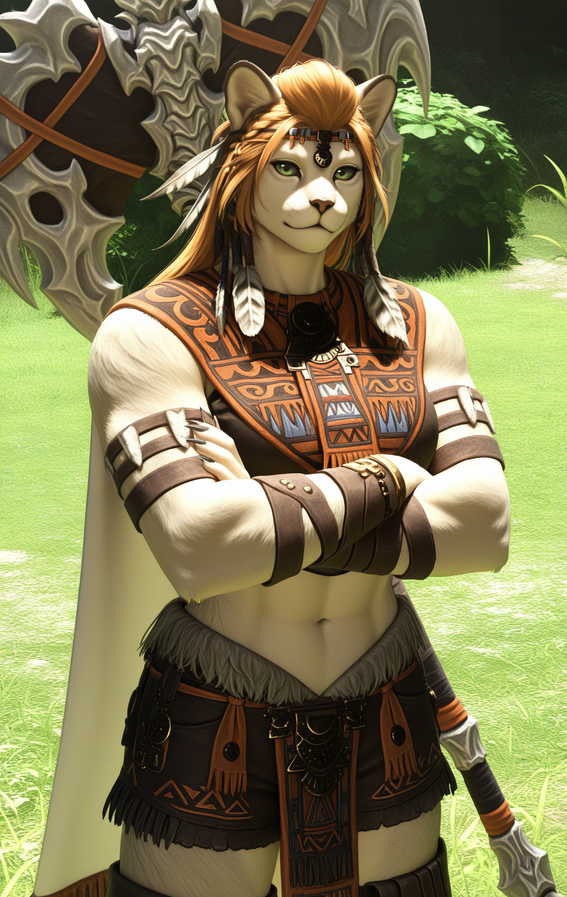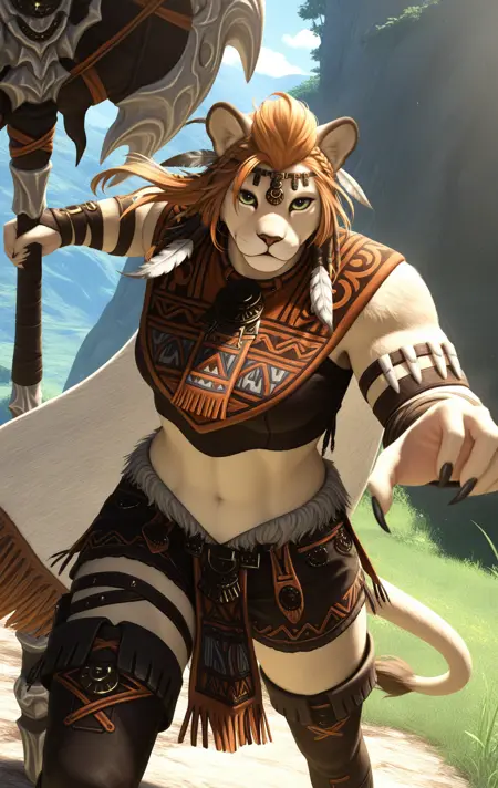 의상 1: ["Wuklamat, 녹색 눈, 주황색 머리, 긴 머리, 머리카락, 여러 개의 땋은 머리, 뒤로 빗어올린 머리, 이마, 얼굴 무늬, 수염, 코, 동물 귀, 깃털 머리 장식, 보석, 꼬리, 원형 머리장식, 팔목장식, 팔찌, 부족 스타일, 갑옷, 옷을 입은 동물, 퓨리, 몸 털, 주황색 망토, 근육질, 목걸이, 좁은 동공, 날카로운 손톱, 검은 손톱"]