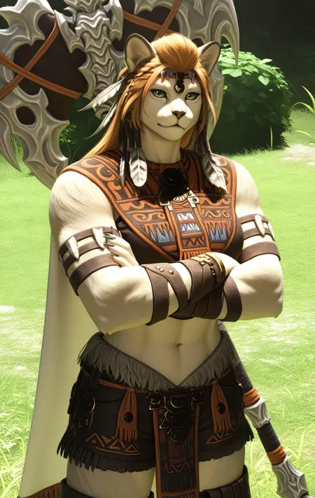 衣装1: ["Wuklamat, 緑の目, オレンジ色の髪, 長い髪, 髪, 複数の編み込み, 後ろに流した髪, 額, 顔の模様, ひげ, 鼻先, 動物の耳, 羽の髪飾り, ジュエリー, 尾, 王冠, 上腕飾り, 腕輪, トライバル, 防具, 着衣の動物, ファリー, 体毛, オレンジ色のマント, 筋肉質, ネックレス, 縦長の瞳孔, 尖った爪, 黒い爪"]