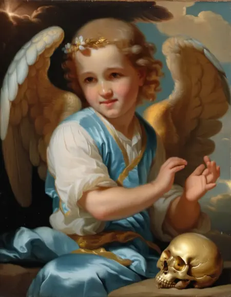 a painting of an angel holding a candle next to a skull in the style of godfried-schalcken