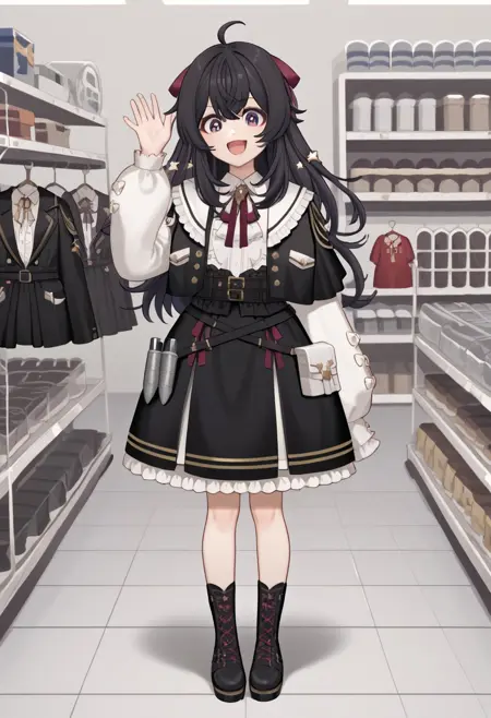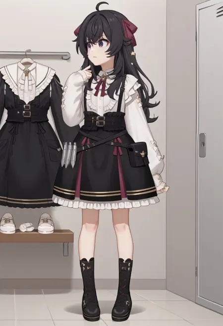 ShippaDark, purple eyes, black hair, black capelet, buttons, red ribbon, black footwear, black dress