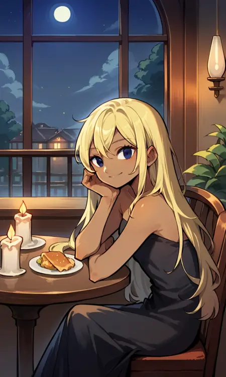 tetra, dark skinned female, blond hair, blue eyes, pointy ears