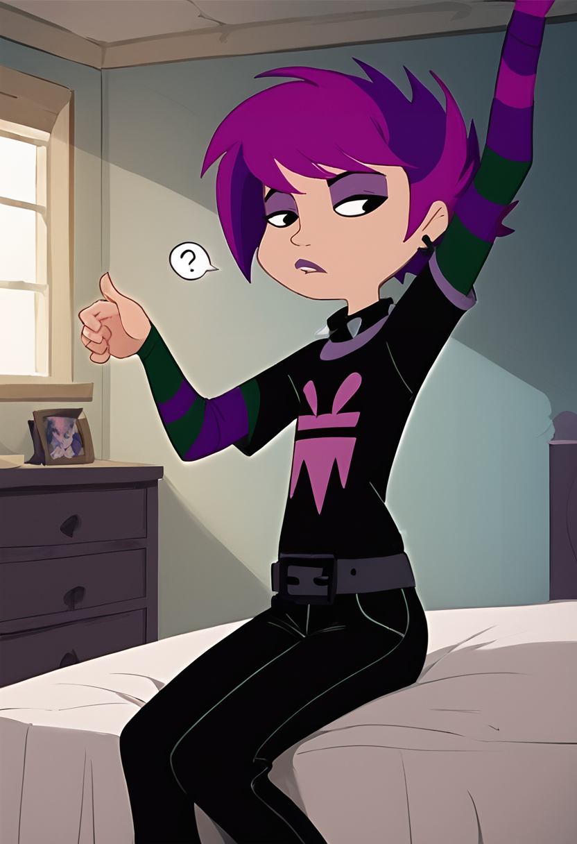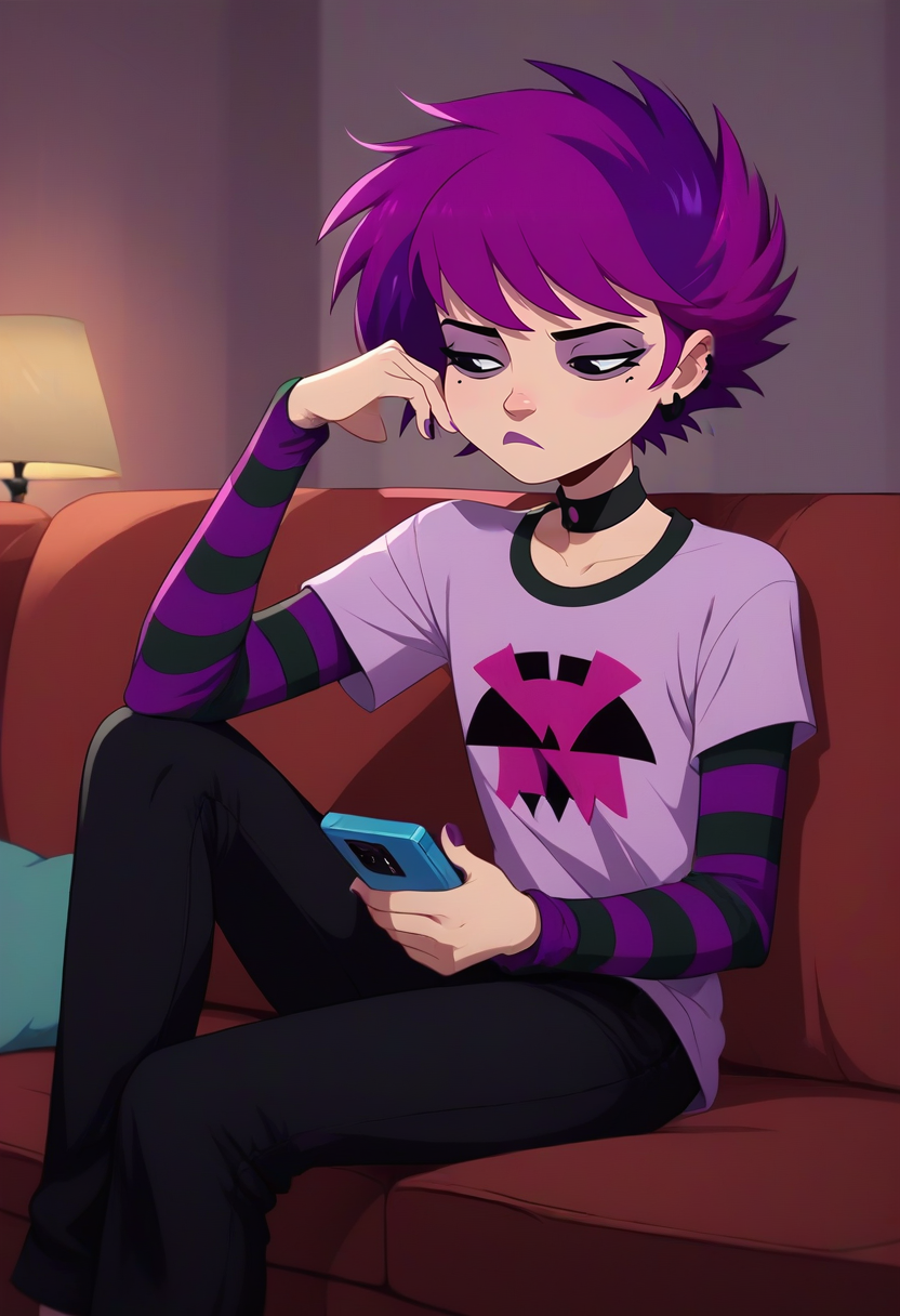 Principal Tags: purple hair, short hair, shirt, striped sleeves, black pants