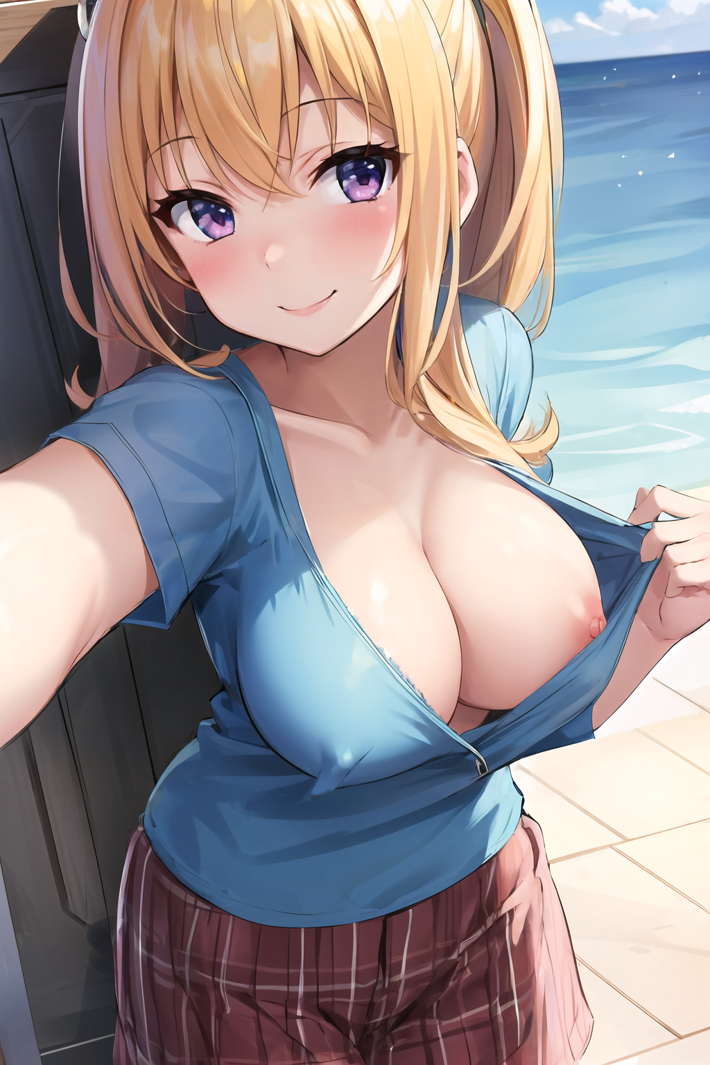 프롬프트: masterpiece, best quality, 1girl, lora:handpull-12:0.9, handpull, pulled by self, clothes pull, shirt pull, flashing, one breast out, no bra, cleavage, selfie, looking at viewer, smile, blush