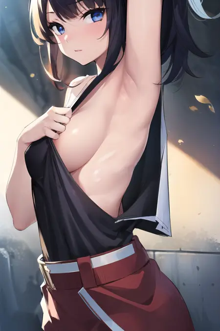 프롬프트: masterpiece, best quality, 1girl, lora:handpull-12:1, handpull, pulled by self, clothes pull, shirt pull, one breast out, no bra, armpits, arm up, from side, upper body, sidelocks, sleeveless, shirt, sideboob, looking at viewer