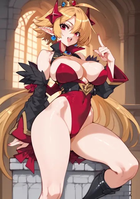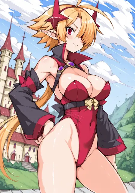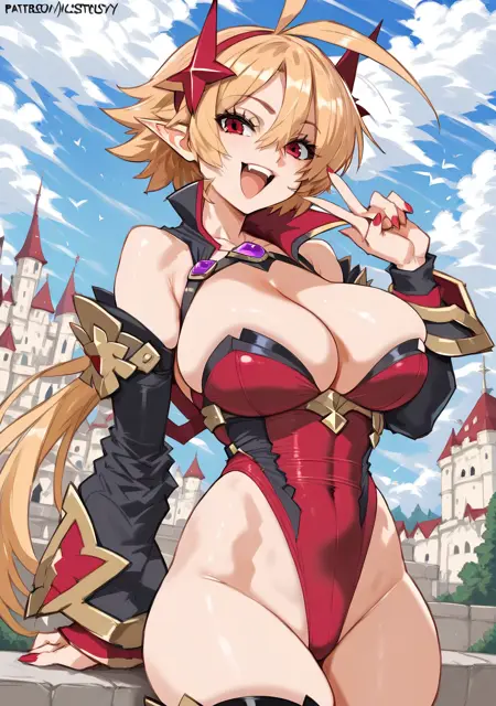 触发词:领主露西、红眼睛、金发、尖耳、大乳房、乳沟、紧身衣、分离式袖子