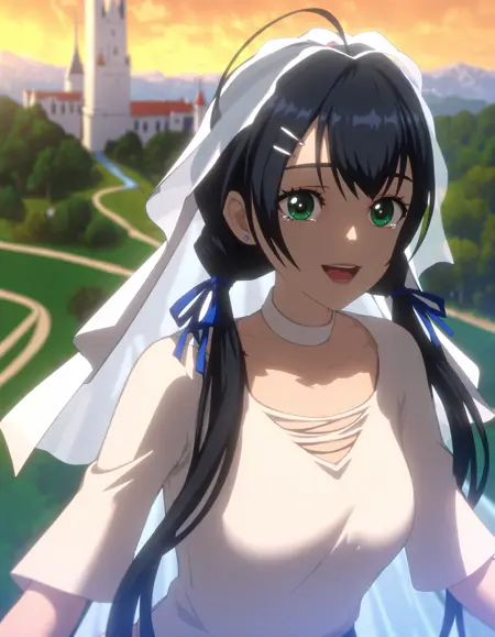 aiwei,1girl,solo,twintails,long hair,jacket,black hair,choker,hair ribbon,low twintails,ribbon,shirt,blue ribbon,hair ornament,white jacket,breasts,bangs,green eyes,earrings,hairclip,ahoge,collarbone,black shirt,jewelry,blue skirt,pleated skirt,